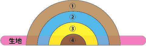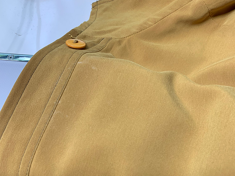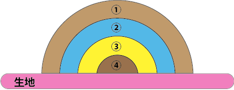 2の図は、シミがついて1週間から10日過ぎたものです。 シミの構造の層を1枚ずつ剥がしていく作業が必要となります。 ここまでが、通常の洗いで対応できる染み抜きです。 |