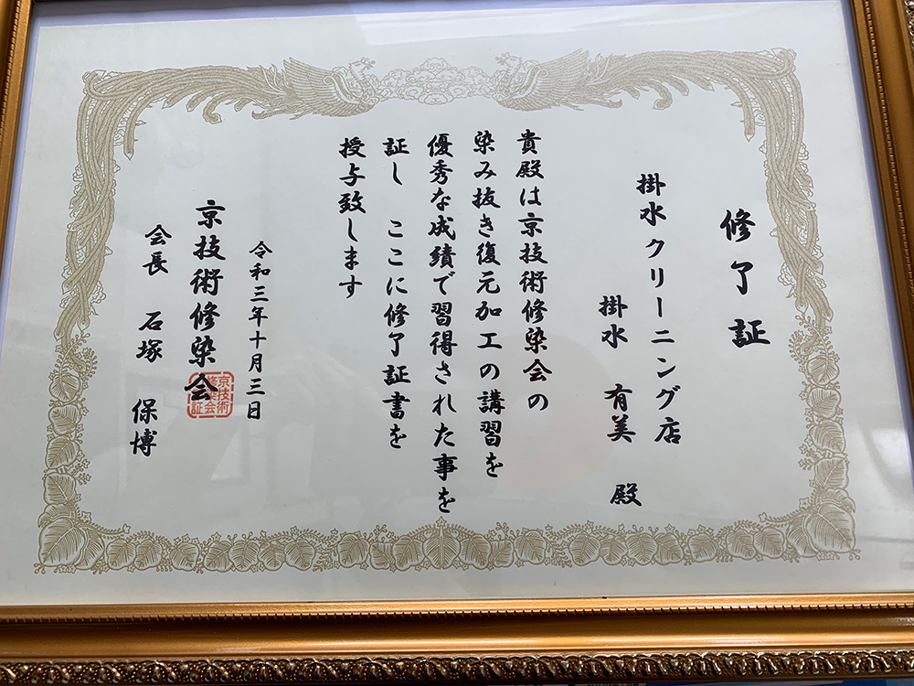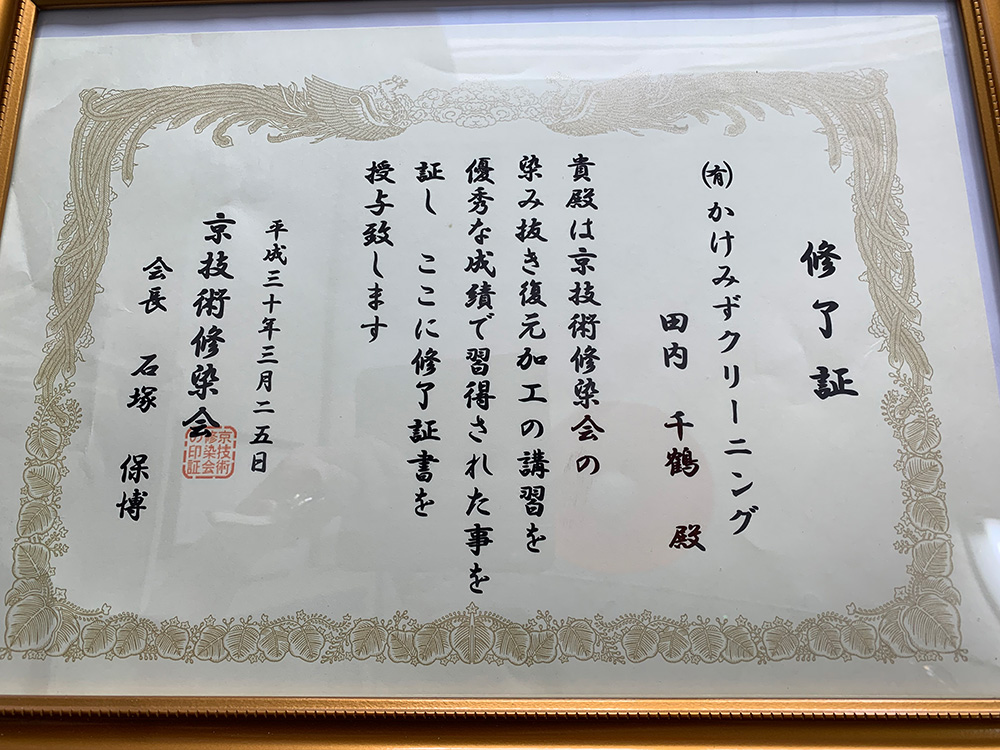 私達、KAKEMIZUクリーニングはまず、復元加工師としてスタートを切りました。京都の素晴らしい技術をこの鳥取県にも!!を、モットーに知識、技術を負い続けて行く次第でございます。
